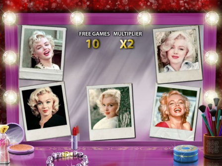 Marilyn Monroe Logo plays the part of the scatter symbol bringing you plenty of attractive cinema bonuses and money gifts. How about winning $5,000,000 just per one spin? Yeah, it's really possible to catch if you can get 5 Marilyn Monroe Logos on the triumphal screen. Hit 3, 4 or 5 scatter symbols at a time? Then, get ready for the shooting with Marilyn because you trigger Backstage Bonus. This exclusive feature offers you up to 45 Free Spins along with 10x multiplier! Bonus Game